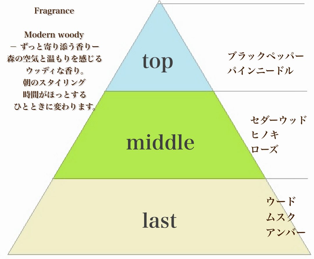 森の空気と温もりを感じるウッディな香り。