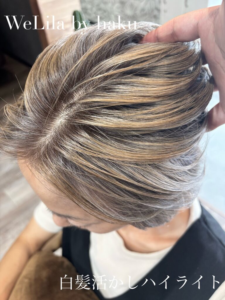 明るめの白髪ぼかし、白髪活かしハイライト