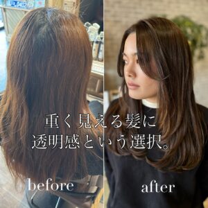 重く見える髪に、透明感という選択。 赤みを抑えたオ…