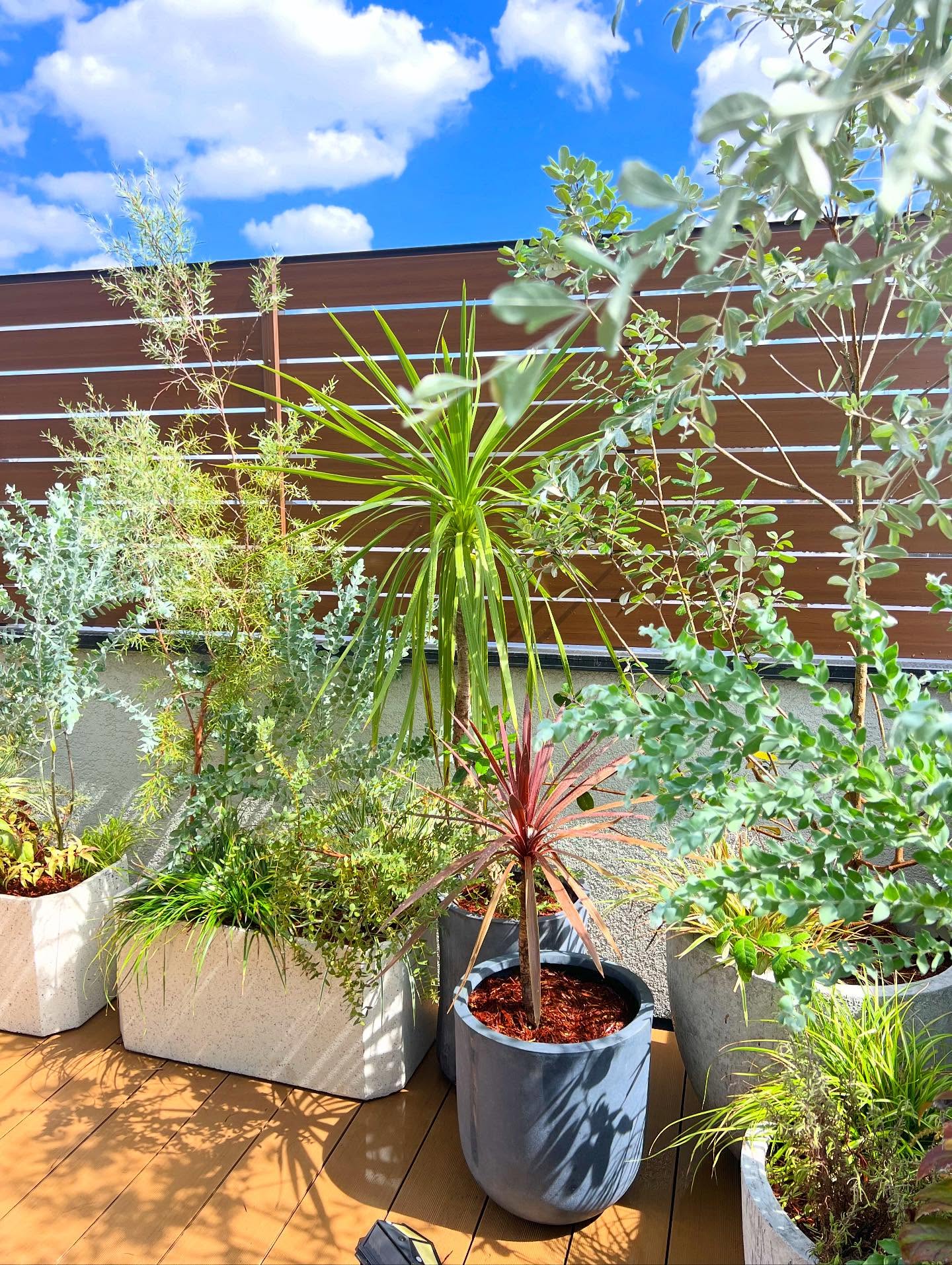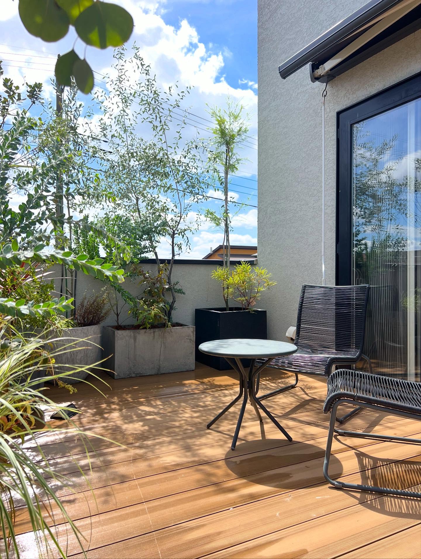 バルコニーの外構植栽をデザイン・施工させて頂きました。 質感の異なるグリーンとプランターを組み合わせ、 都会的で洗練されたプライベート空間を演出しています。