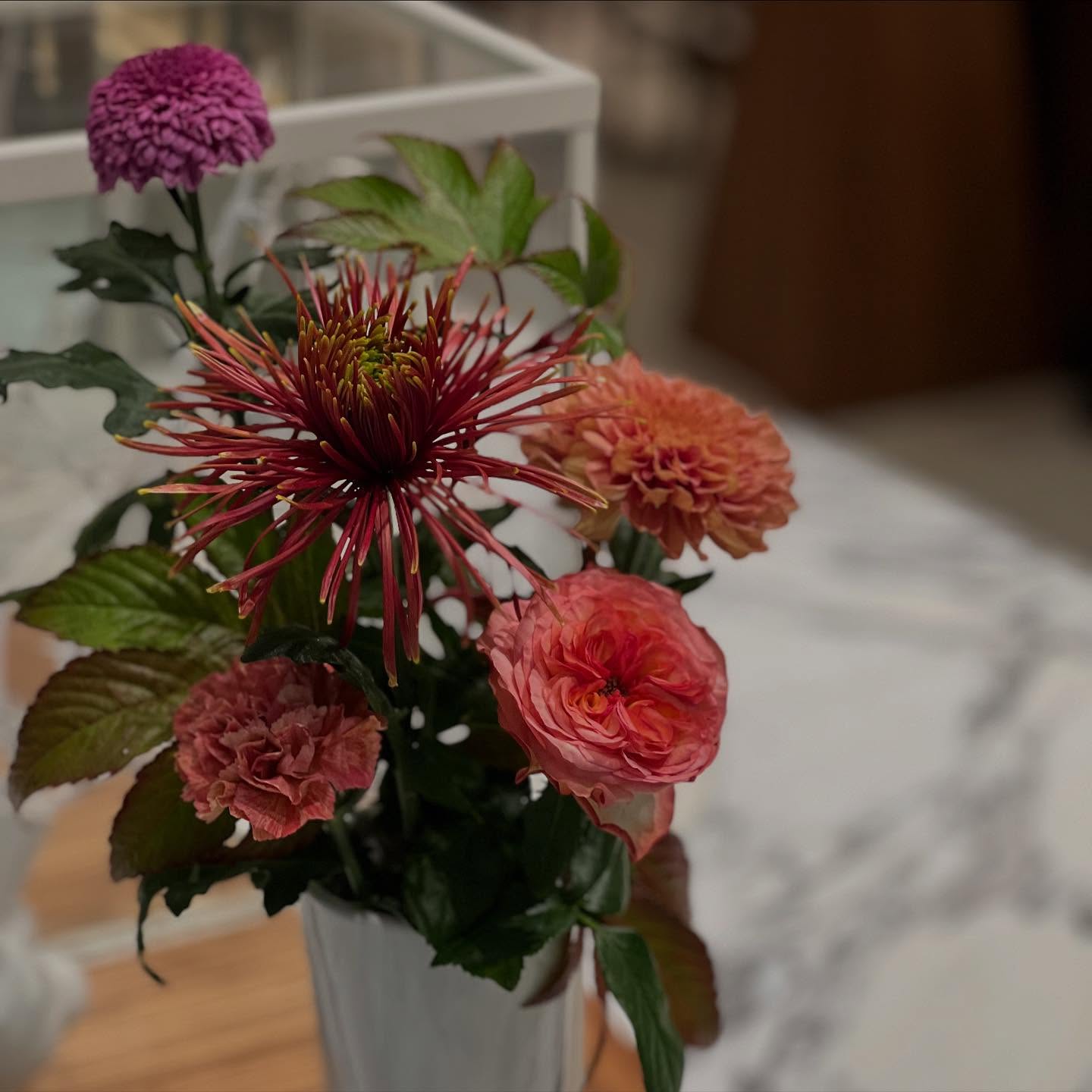 旬の『ダリア』『マム』『バラ』がもりもりのBOXアレンジメント! ダリアも咲き方が色々?このこは中心がはっきり見えていま...