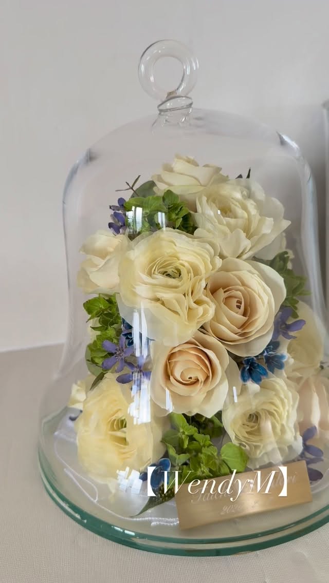 白いバラにグリーンとブルーのミックスの色合いが素敵です幸せのベルの形が可愛いウェンディです🕊️